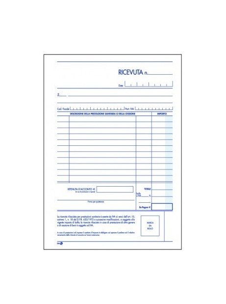favorite_border Aggiungi alla Wishlist Quick view Carrello Modulistica Ricevuta Sanitaria A5 Registro onorari e fatture Duplice 2 copie 15x21cm Mod.912 Prezzo 2,30 € Ricevuta Sanitaria A5 15x21 cm 2 copie Mod.912