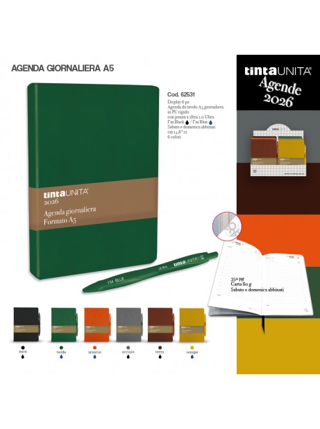 favorite_border Aggiungi alla Wishlist Nuovo Quick view visibility Vedi Agende-Calendari Agenda Giornaliera 2026 TintaUnita con penna abbinata in a5 15x21cm Prezzo 10,00 € Agenda giornaliera in a5 con sabato e domenica abbinati by TintaUNita e penna in omaggio