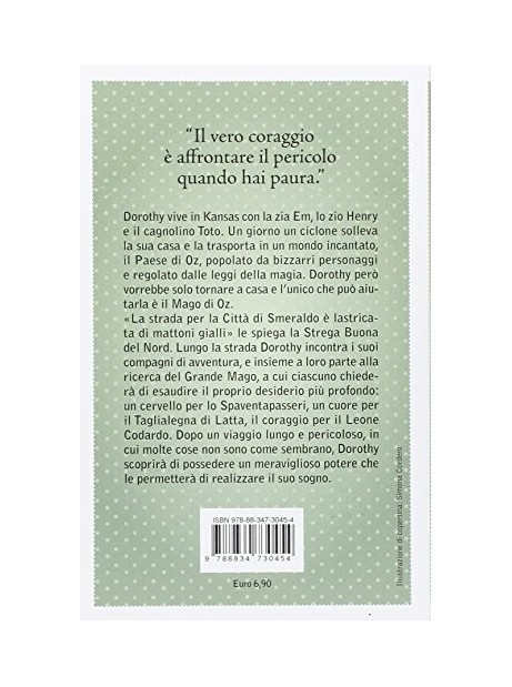 Dimmi qualcosa di te e dei posto da cui vieni fece lo Spaventapasseri quando lei ebbe finito il suo pasto. Così la bimba gli raccontò tutto del Kansas, e di come ogni cosa fosse grigia, e di come il ciclone l'avesse trasportata fino a quella bizzarra Terra di Oz. Lo Spaventapasseri ascoltò attentamente e poi disse: "Non riesco a capire perché dovresti desiderare di lasciare questo bel Paese per tornare in quel posto secco e grigio che chiami Kansas." "È perché non hai cervello" rispose la bambina. "Per quanto squallida e grigia sia casa nostra, noi gente di carne e sangue preferiamo vivere lì che in qualunque altro posto, per bello che sia. Non c'è un posto bello come casa propria." Lo Spaventapasseri sospirò. "Ovvio che non posso capirlo" disse. "Se aveste la testa di paglia come la mia, probabilmente vivreste solo in posti belli, e il Kansas sarebbe vuoto. È una fortuna per il Kansas che abbiate un cervello. Introduzione di Beatrice Masini. Età di lettura: da 9 anni.