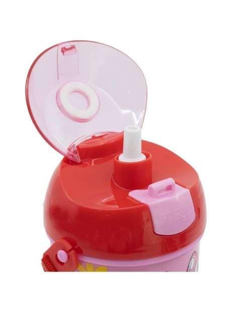 La borraccia in plastica riutilizzabile rigida, idonea al contatto con gli alimenti, con sistema di bevuta pop-up che consente di aprire la bottiglia con una semplice pressione del pulsante: premendo il pulsante situato sul tappo questo si apre e spingendo verso il basso il beccuccio retraibile si richiude. Molto comoda da portare sia a scuola che durante le passeggiate grazie alla tracolla di cui è dotata la borraccia, altrettanto indicata per chi effettua sport per un rapido sorso tra una cosa e l'altra.