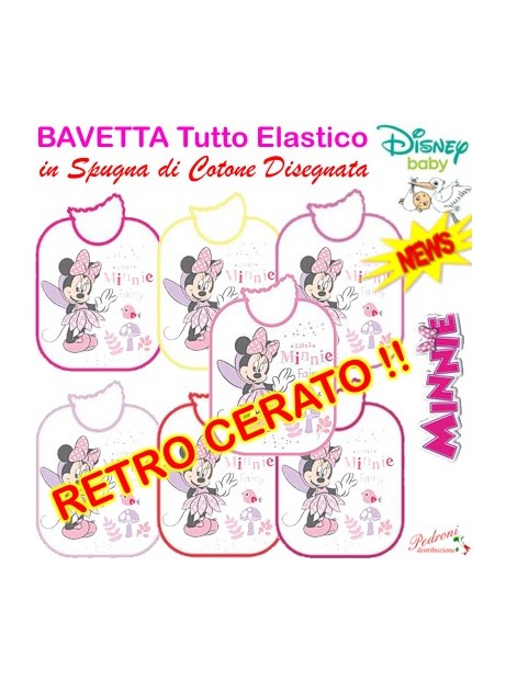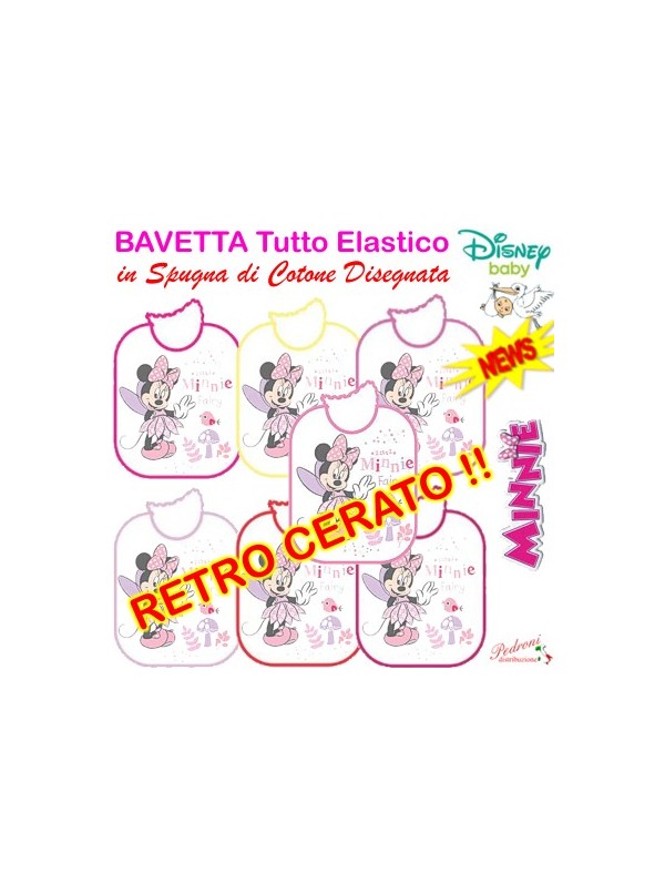 Bavaglia con RETRO CERATO " Antimacchia " e fronte in morbida spugna di COTONE con disegni " MINNIE MOUSE " come fotografia e allacciatura tutto elastico.