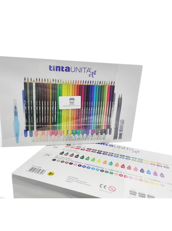 Contiene 36 pastelli 4.0mm + 18 pennarelli Brush + Pastelli a cera + 1 Water Brush + 1 matita HB + 1 gomma + 1 temperino