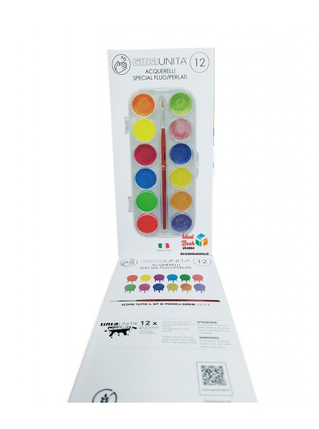 Confezione di Acquerelli 12 colori Fluo e Perlati +Pennello - Tinta Unita