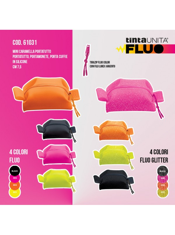 Borsellino Caramella mini TintaUnita Fluo, semplice da pulire ed igienizzre indispensabile a scuola, al mare o in borsa. Astuccio porta tutto.