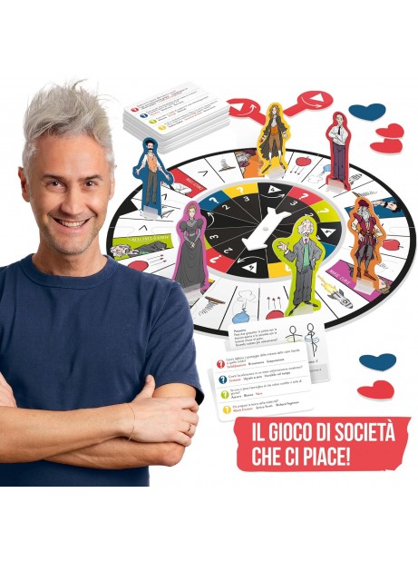 OTTIMI CONTENUTI per giocare in più modi e divertirsi imparando: tabellone; 1 mazzo da 55 carte; 1 spinner; 6 stand; 6 palette voto; 13 gettoni segnagiro; Regolamento