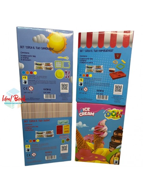 - crea il tuo gelato con 4 salsicciotti di plastillina da 50gr, 2 forme per cono, 1 stampino, 1 stampo gelato e 1 accessorio