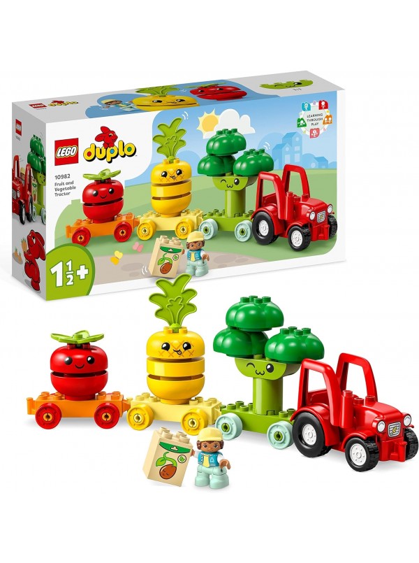 Il gioco educativo LEGO DUPLO Il Trattore di Frutta e Verdura aiuta i bambini dai 1,5 anni in su a sviluppare le abilità motorie mentre impilano i mattoncini per "far crescere" le piante Include un trattore giocattolo, 3 rimorchi di colori diversi, mattoncini per costruire broccoli, pomodori e ananas, oltre al personaggio
