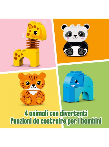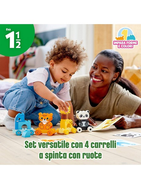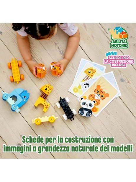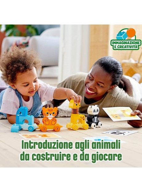I piccoli si divertiranno con l'elefante, la tigre, la giraffa e il panda. Mentre costruiscono e ricostruiscono, allineano i vagoncini, posizionano gli animali sul treno, li rimuovono e li impilano uno sull'altro, i bambini sviluppano capacità motorie complesse e scoprono un mondo di giochi di ruolo e fantasia. Alcune funzioni innovative, come il collo mobile della giraffa, aumentano ulteriormente il divertimento. Le schede per la costruzione con immagini a grandezza naturale dei modelli permettono ai bambini di posizionare i mattoncini sull'immagine durante la costruzione. Il treno può inoltre essere collegato ad altri giocattoli LEGO® DUPLO® su ruote.