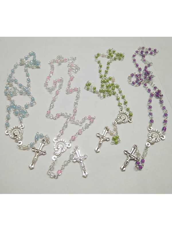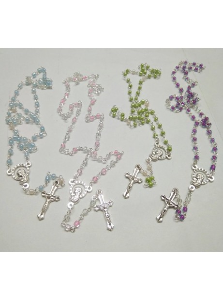 Coroncina con grani colorati Croce e meglia argentati con scatola a forma di fiore