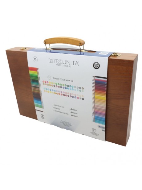 72 colori assortiti così composti: 36 Pastelli Tinta Unita Classic 4.2br + 36 Pastelli Tinta Unita Pastel 4.2 + 1 Matita HB n. 2 + 1 Gomma Architetto + 1 Temperino 1 foro Metal