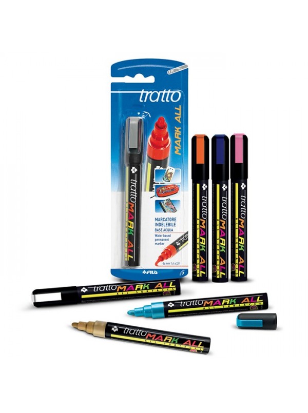 Tratto Mark All è il marcatore indelebile a base d'acqua ideale per decorare e colorare tutte le superfici, con una gamma di 15 colori moda brillanti e decisi. Scrive su carta, plastica, cd, tessuti,vetro, metallo. Non passa la carta.