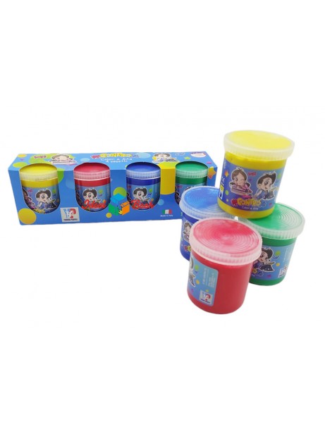 - 4 vasetti di colori a dita da 80ml SUPER LAVABILI, nei colori giallo, nero, blu, bianco, verde e rosso.