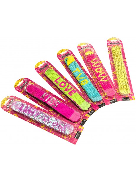 Bracciali Fluo Girabrilla, con paillettes reversibili che possono contenere o meno una parola.