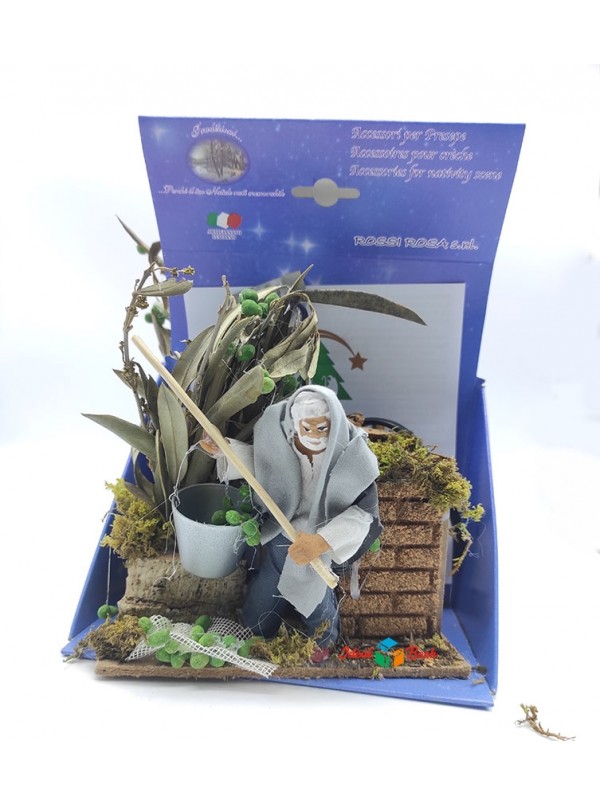 Mestieri per presepe con movimento a corrente, raccoglitore di olive realizzato con materiali naturali, dimensione personaggio 10cm.