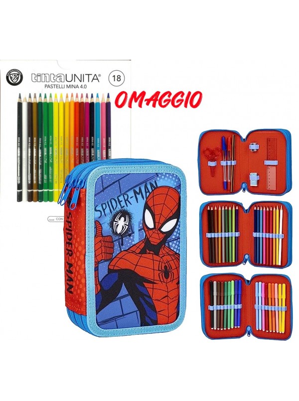 Astuccio 3 Zip SPIDERMAN blu completo colori Giotto + 18 pastelli TintaUnita