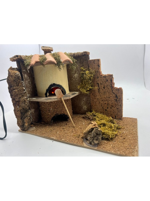 Forno in legno su base con pala pizze e luce tremolante per presepe