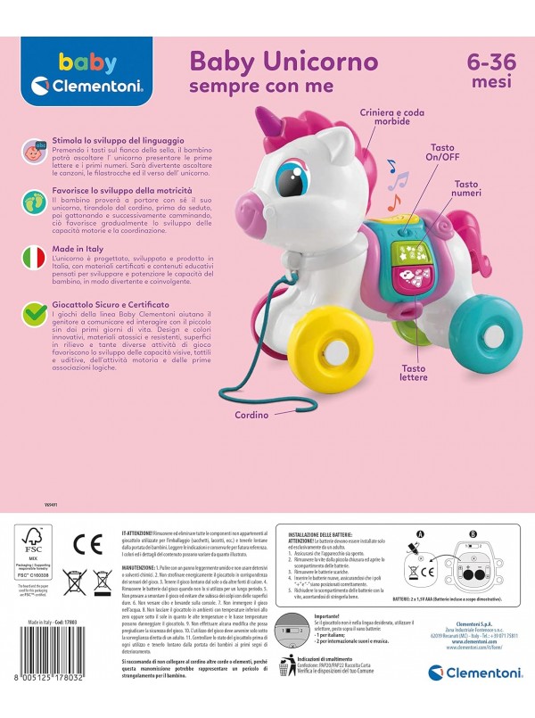 IMPARARE GIOCANDO: l'unicorno stimola lo sviluppo motorio, portando i più piccoli a gattonare, camminare e trainare il cavallino; grazie ai tasti interattivi, i più piccoli scoprono le prime lettere e i numeri, intrattenendo con filastrocche e canzoni