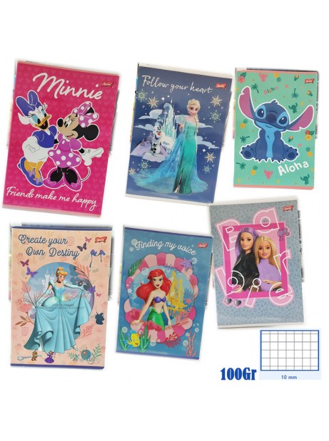 Quaderno scuola prima seconda elementare a Quadretti 10MM 100Gr Principesse Disney, Stitch, Minnie, Frozen, Barbie