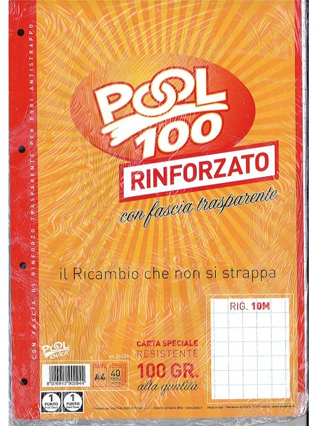 Ricambi per Raccoglitore ad anelli A4, Banda Rinforzata sui fori, Quadretti da 10mm di Prima e Seconda elementare senza margini, 40 fogli da 100Gr - PoolOver - TintaUnita