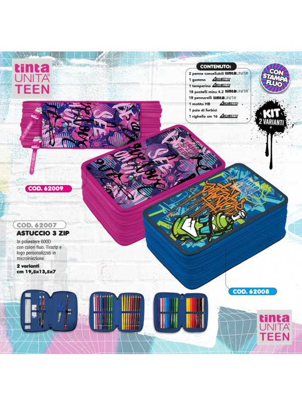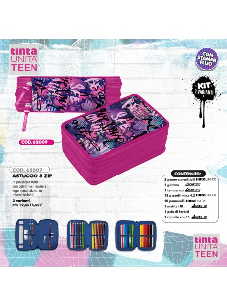 Astuccio 3zip Borsellino TintaUnita Teen 2025 completo di colori e cancelleria