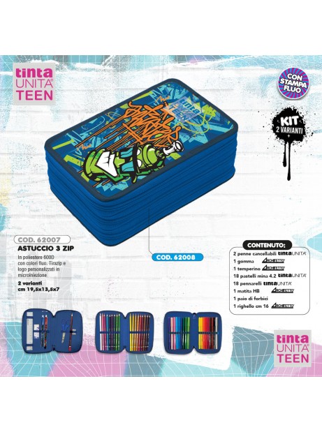 Astuccio 3 zip by Tinta Unita Astuccio con 3 scomparti completo di 18 colori a matita, 18 colori a spirito, 2 penne, matita, righello, gomma e temperino