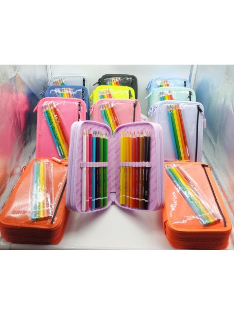 Astuccio Tinta Unita 4Zip Completo di colori e cancelleria Fluo Pastello Scuola