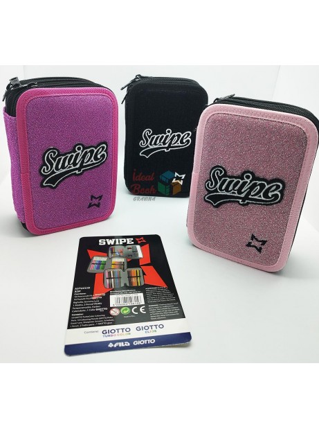 Astuccio 3 zip Swipe 2023 Glitter, fucsia, rosa o nero completo colori Giotto