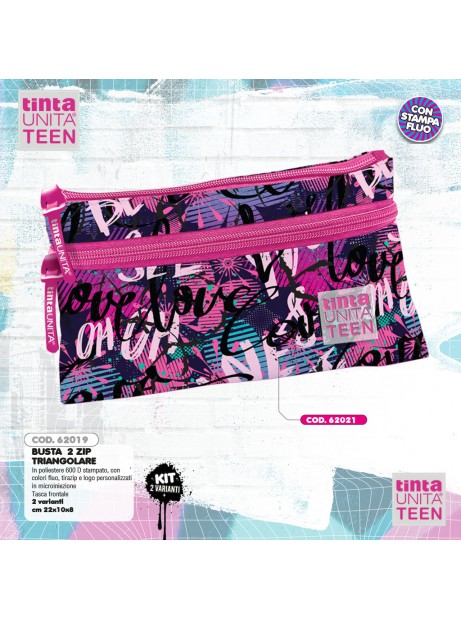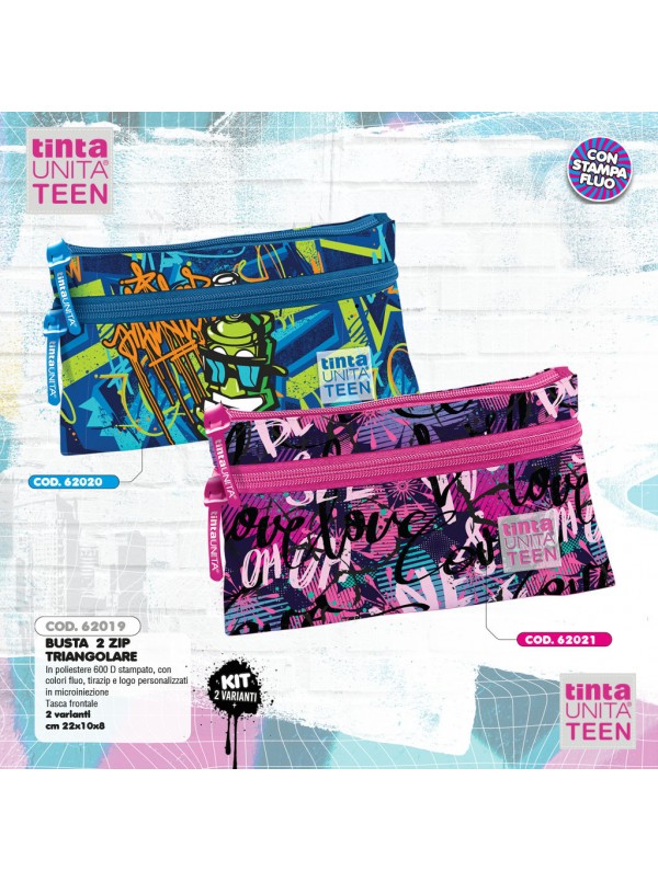 Borsellino Astuccio Triangolare TintaUnita Teen rosa, blu con 2 zip