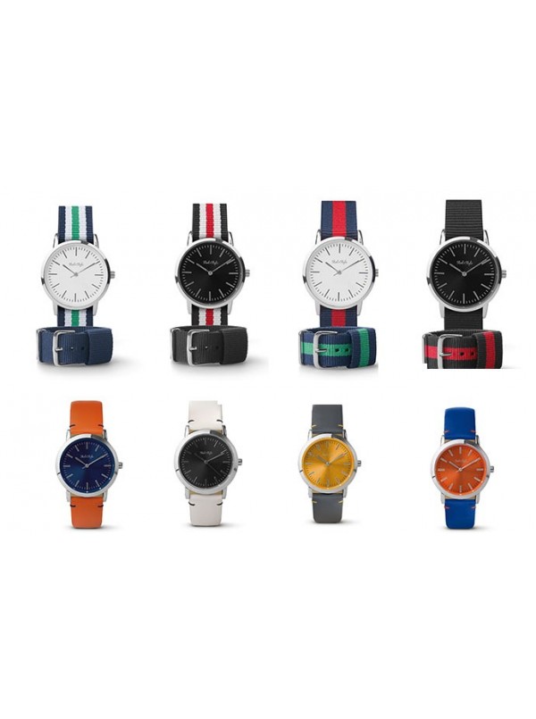 Orologio da polso 'double belt' (gift&style) con cinturino removibile in tela colorata (nero o grigio/rosso) - cassa in metallo leggero finitura nichel - diametro 36mm con quadrante nero - funzionamento al quarzo - confezione in scatola regalo