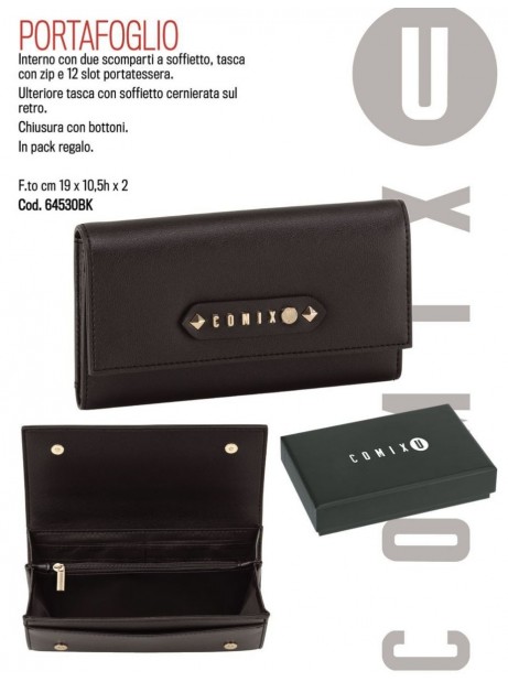 Interno con due scomparti a soffietto, tasca con zip e 12 slot portatessera.
