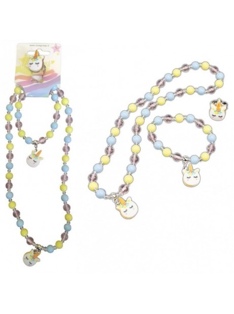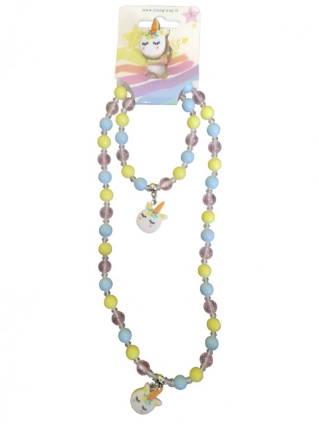Set Bracciale, collana, anello per bambina perle colorate con pendente unicorno