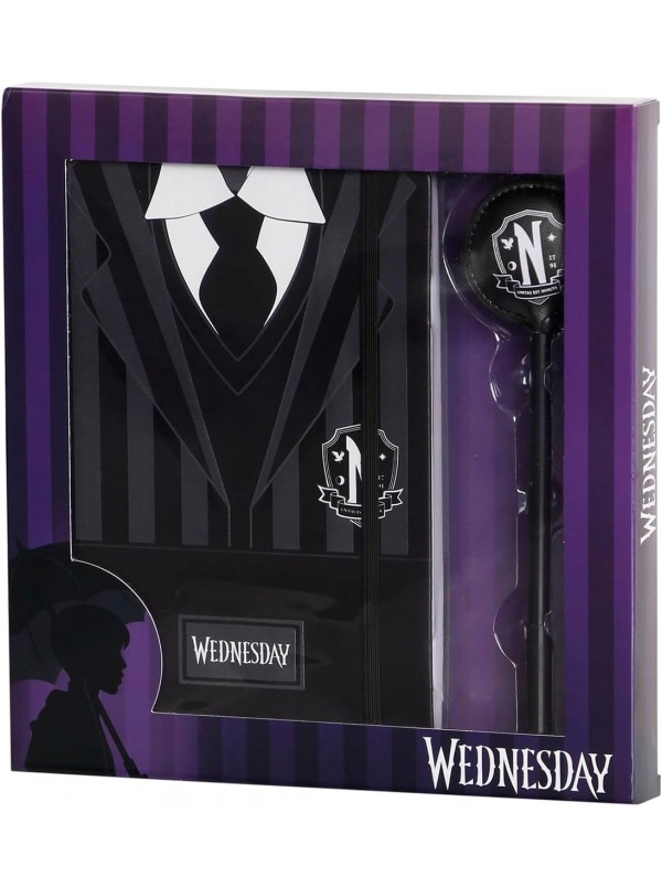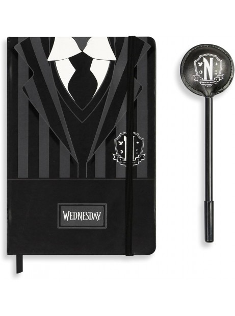 Confezione Regalo con Diario, quaderno con elastico, copertina ad uniforme di Mercoledì e Penna a Sfera Fashion, Nero