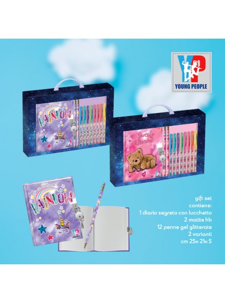Diario Segreto Young People girl Orsetto Unicorno + 12 penne glitter Tinta Unita