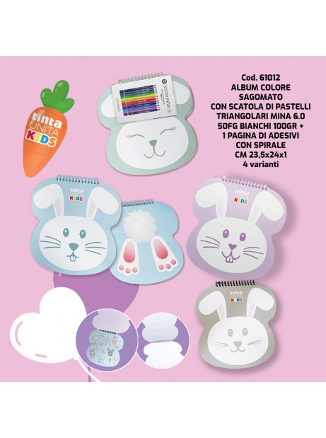 Fantastico album da colorara a forma di coniglietto, fogli bianchi + stickers + omaggio pastelli big triangolari TintaUnita
