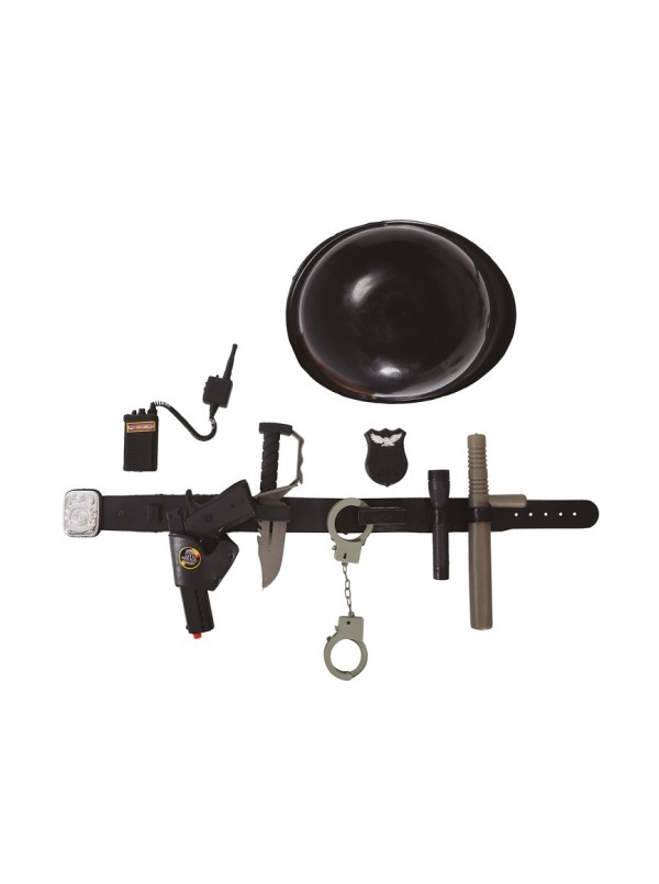 Cinturone da poliziotto con casco, pistola, manette, torcia, manganello
