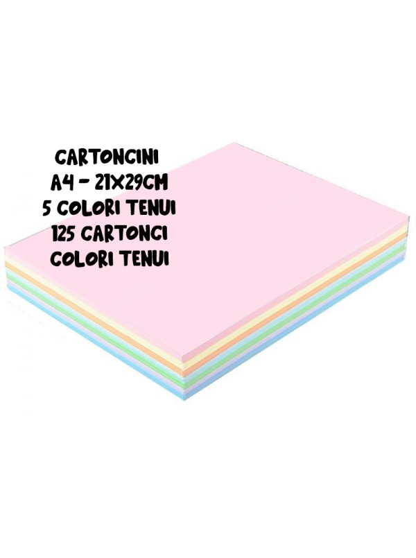 Risma da 125 cartoncini colorati assortiti, dimensione A4 21x29cm nei colori blu, verde, rosso, arancio e giallo, tonalità tenue pastello.