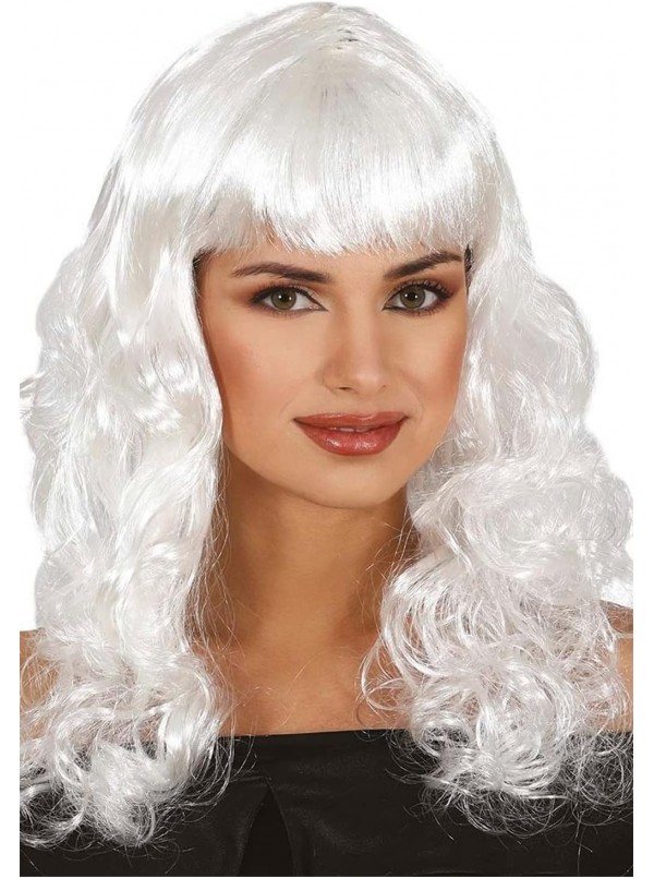 Parrucca con Capelli lisci, lunghi, mossi, bianchi e frangetta per Carnevale