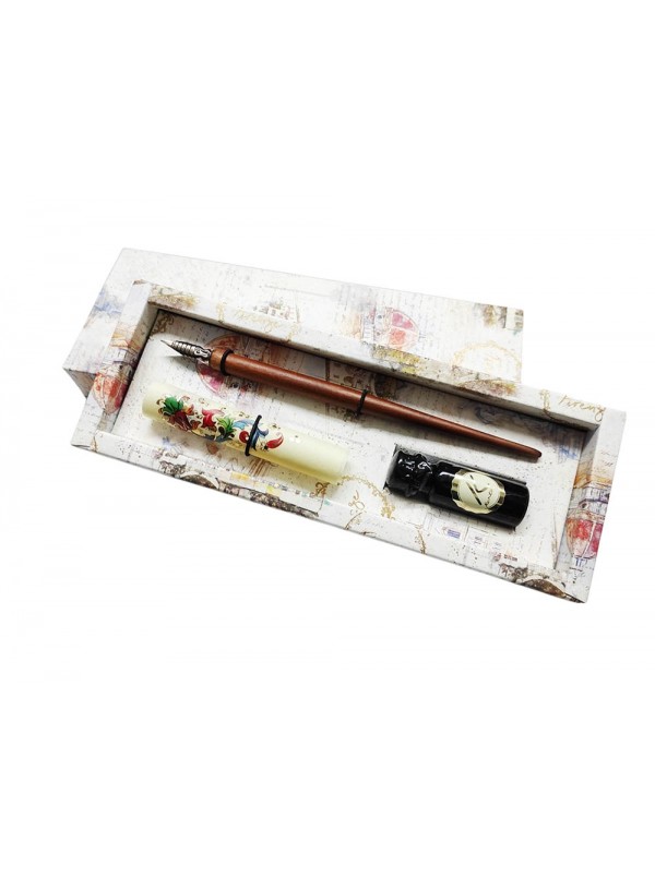 Scatola regalo Penna Stilografica, pennino in legno con pergamena e inchiostro di china nero, modello Firenze